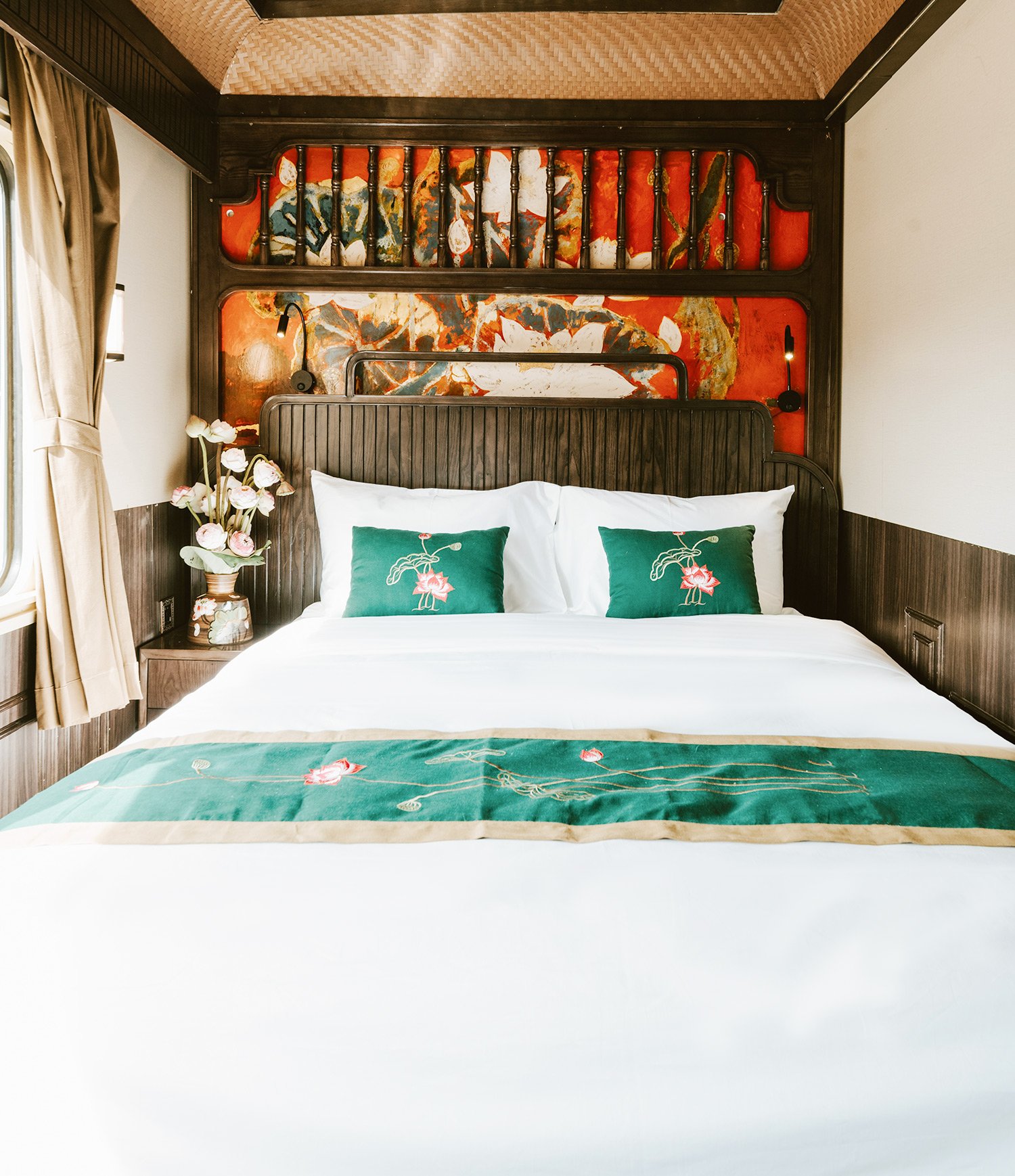 The train carriages feature elegant interiors inspired by the Indochine style. Using Asian elements like wood, bamboo, and rattan, the design captures the charm of Vietnam’s past. With two types of cabins available, each thoughtfully crafted, there’s a comfortable space for every passenger on this memorable journey.