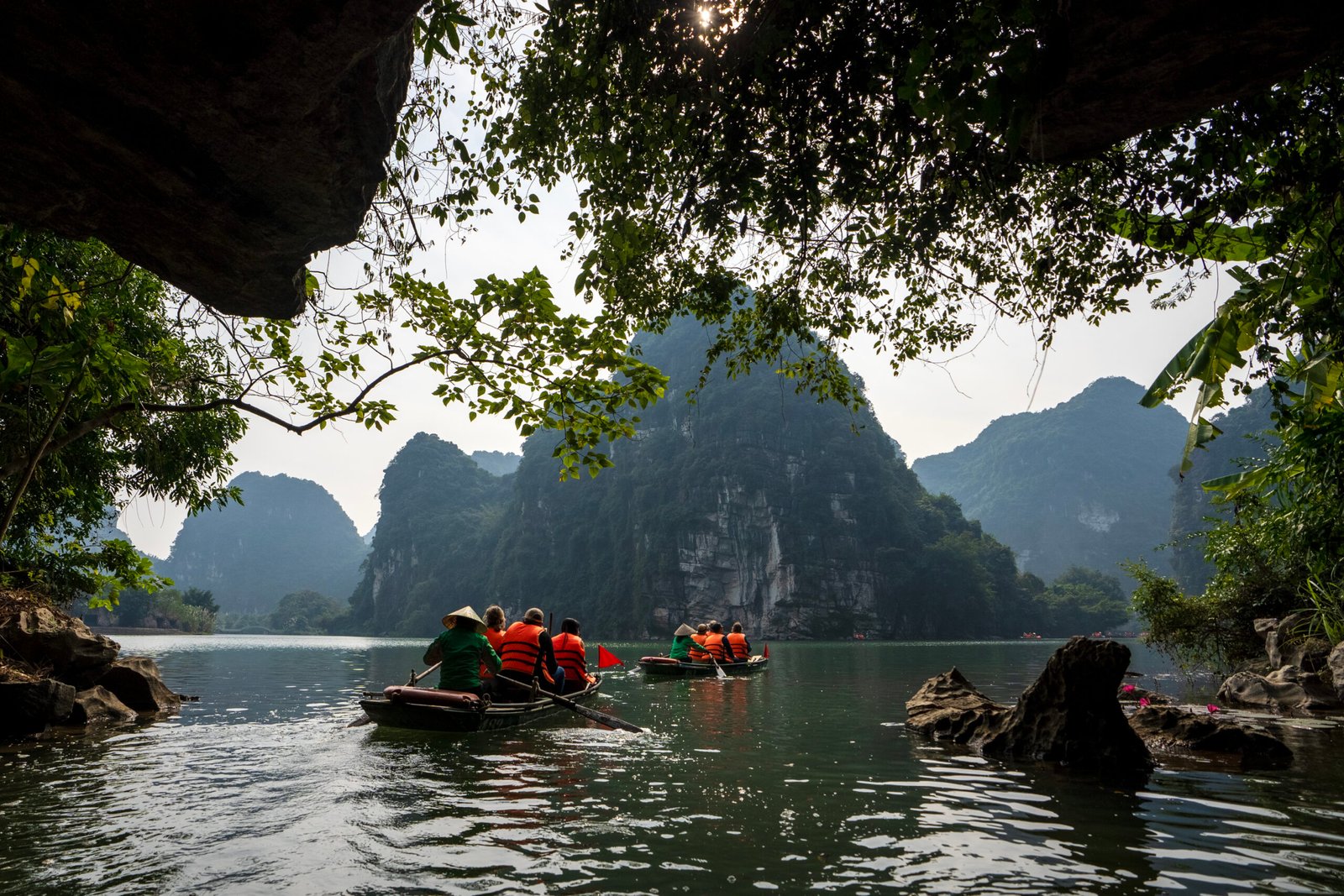 The journey transitions seamlessly from the comfort of the train to the serene embrace of Trang An’s emerald waters. Here, aboard a sampan, you are invited to navigate through a beautiful landscape. Amidst the grandeur of towering limestone cliffs and lush greenery, this journey offers an intimate glimpse into the heart of nature’s splendor.