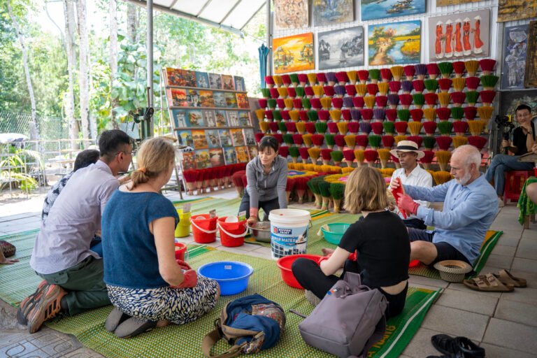 From there, continue the journey to Phu Tan Mat Weaving Village, where generations of artisans have perfected the age-old craft of weaving mats from rush grass. As you wander through the village, observe the skilled hands at work, weaving colorful threads into practical yet beautiful creations. The scent of sun-dried grass fills the air, and the steady, rhythmic sound of the looms becomes an unexpected melody of rural life. It’s not just a visit; it’s a step into a living tradition — an invitation to slow down, to witness the artistry of hands guided by time and heart.